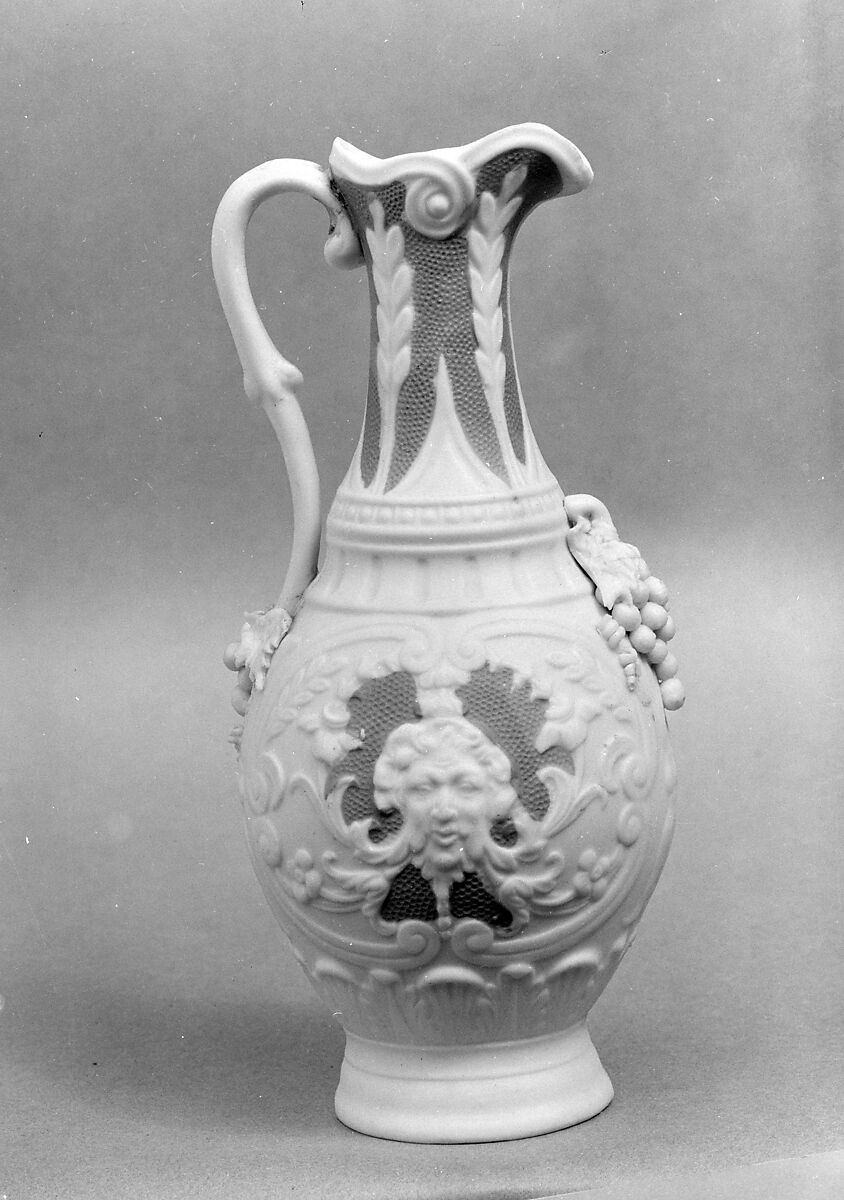 Named in reference to the ancient marble quarry on the Greek island of Parros, parian has higher proportion of feldspar than conventional porcelain, resulting in a vitrified biscuit body that resembles white statuary marble. Stylish and affordable, parian statuary and hollowware were extremely popular household ornaments in the mid-nineteenth century. This vessel was likely made by the United States Pottery Company, which exhibited parian to great acclaim at the 1853 Crystal Palace Exhibition in New York.