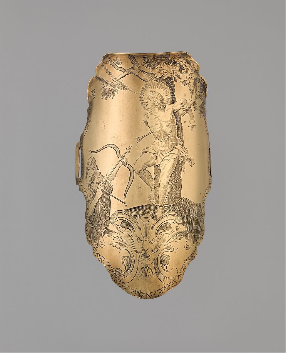An archer wears a bracer to protect the inner forearm against whiplash from the bowstring. Most bracers were made of bone, horn, or leather with little or no ornament. This example, made of polished copper, is very unusual for its elaborate and finely engraved decoration, which features the martyrdom of Saint Sebastian, patron saint of archers. The inscription around its border mentions the town of Ath in Belgium, the name Joseph de Somme (probably the owner or maker of the bracer), and the date.