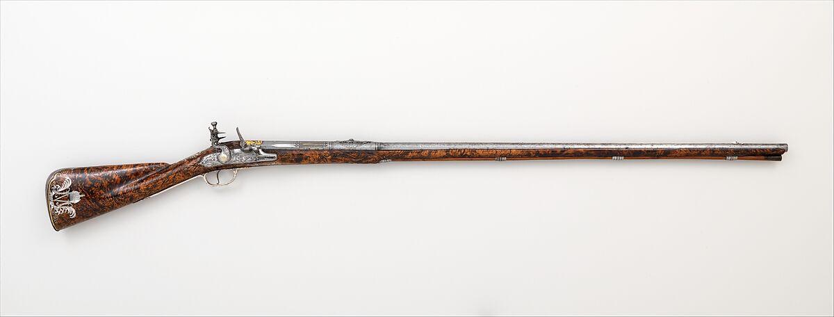 This flintlock sporting gun was made in Vienna for Empress Margarita Teresa (reigned 1666–73), Infante of Spain and wife of Holy Roman Emperor Leopold I (reigned 1658–1705). The empress's crowned monogram in silver is inlaid on each side of the butt, and her arms, an imperial double-headed eagle bearing the shields of Austria and Spain, are engraved on the silver escutcheon on the grip of the stock. The gun's august ownership is matched by the quality of manufacture. It is a work by Jacques (Jacob) Lamarre, a Parisian gunmaker who sought his forture at the imperial court about 1670.