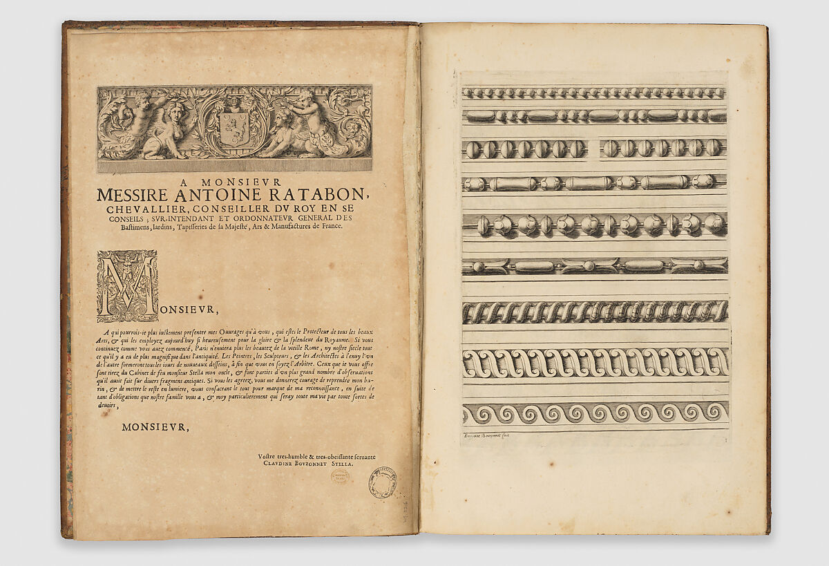 In 1658, Françoise Bouzonnet etched this book of antique ornament designs under the supervision of her older sister and teacher, Claudine Bouzonnet Stella. Baroque painters kept architectural pattern books like this one in their workshops as references when composing their classical landscapes. In her dedication to the volume, Bouzonnet Stella assumes leadership of its publication and thanks a French royal arts administrator, Antoine Ratabon, for his support of her family’s artistic pursuits.