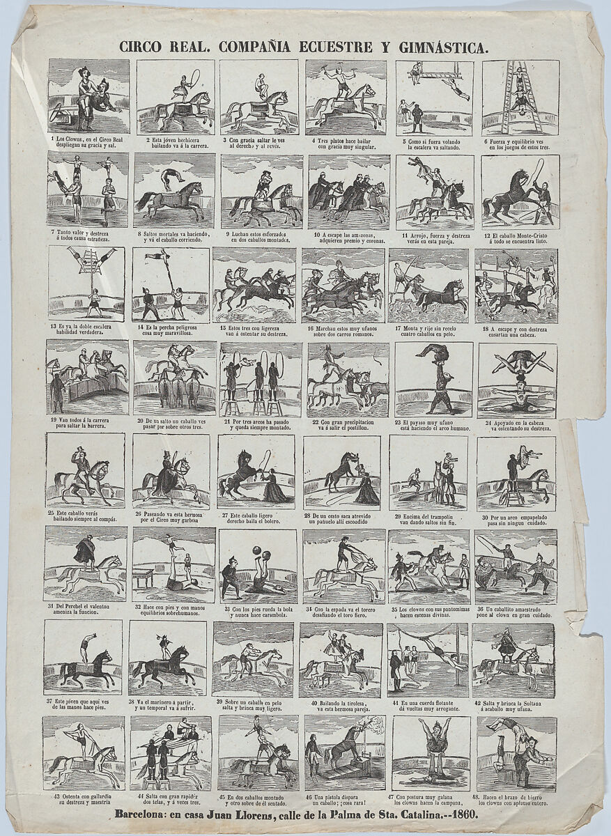 - Title:Broadside with 48 scenes depicting the equestrian and gymnastic moves of the royal circus