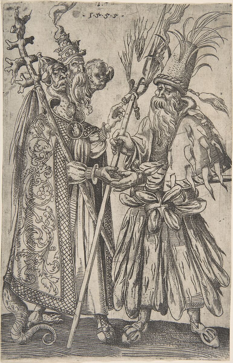 This etching is one of a large group of harshly satirical depictions of the pope produced during the immediate aftermath of the Reformation. The caricatured pope is represented with three heads: the one in the middle bears the papal tiara, the one at left a turban, while the one at right is represented as that of an infant. Other features serve to underscore the covert, demonic nature that some Protestants attributed to representatives of the Catholic Church: one of his hands and one of his feet are depicted in a grotesque, nonhuman state, and a large lizardlike tail extends from beneath the papal robe. Affixed to the front of the robe is a broach with the insignia of a frog, a common symbol of false religion. The pope is shown handing a number of coins to a figure represented as a soldier, who holds a halberd that emits flames. Implied together with the hybrid character of the pope is that the church bribes for the benefit of military protection, and that its actions are driven by a devious, animalistic nature. This image, by an anonymous German artist, is representative of a genre of popular print critical of the Catholic Church, disseminated well into the seventeenth century in Germany and the Netherlands.