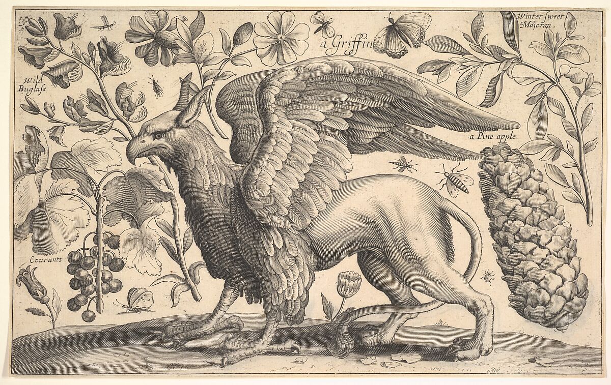 A griffin, surrounded by numerous plants, flowers, and insects, and a pineapple; after Hollar.