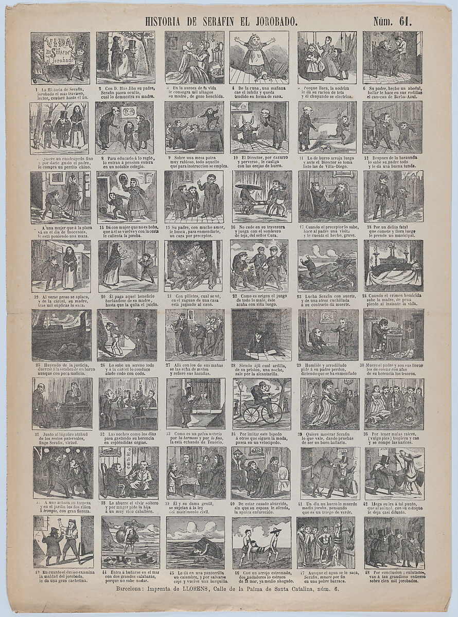 - Title:Broadside with 48 scenes relating to the life hunchback
