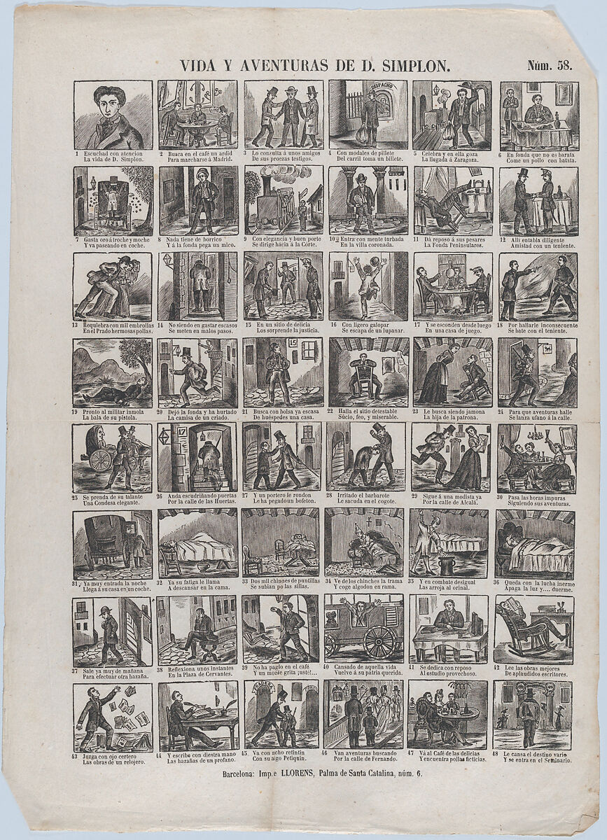 - Title:Broadside with 48 scenes depicting the life and adventures of Don Simplon