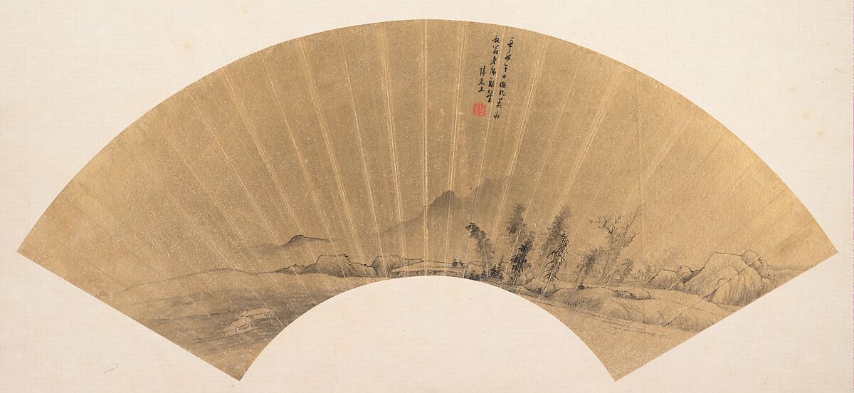 This evocative vignette is signed by a certain Lu Kezheng, an obscure artist who has gone unrecorded in histories of Chinese painting. Centering the composition on the lower half of the fan, Lu left the top shrouded in mist, creating a feeling of suspense by withholding a view into the far distance. The painting is dated according to the sixty-year cycle of the premodern Chinese calendar, so it is not possible to know whether it was made in 1591 or sixty years later in 1651, although the latter seems more likely based on its style.