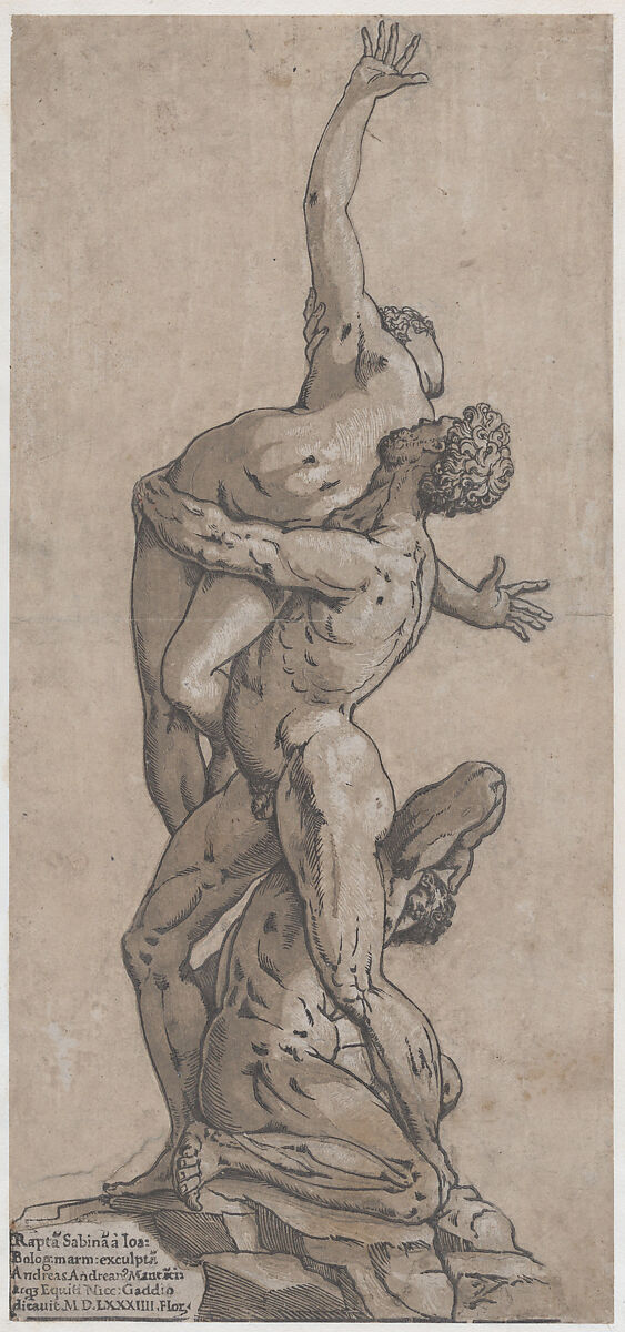 This monumental print reproduces Giambologna’s famous Florentine sculpture 'Rape of the Sabine Woman'. In his highly original configuration of contorted and intertwined bodies, Giambologna achieved the suggestion of dramatic movement and force—aspects that made the artwork an icon of Renaissance sculpture. To capture its three-dimensional quality, the printmaker Andreani made three different woodcuts after Giambologna’s masterpiece, each depicting the sculpture from a different angle. The technique of chiaroscuro woodcut allowed the printmaker to suggest volume, using three woodblocks; one to render the contour lines, and the others to achieve convincing modulation of the bodies and background.