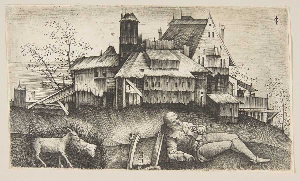 The old shepherd lying in a landscape, buildings behind, a goat and a sheep to the left