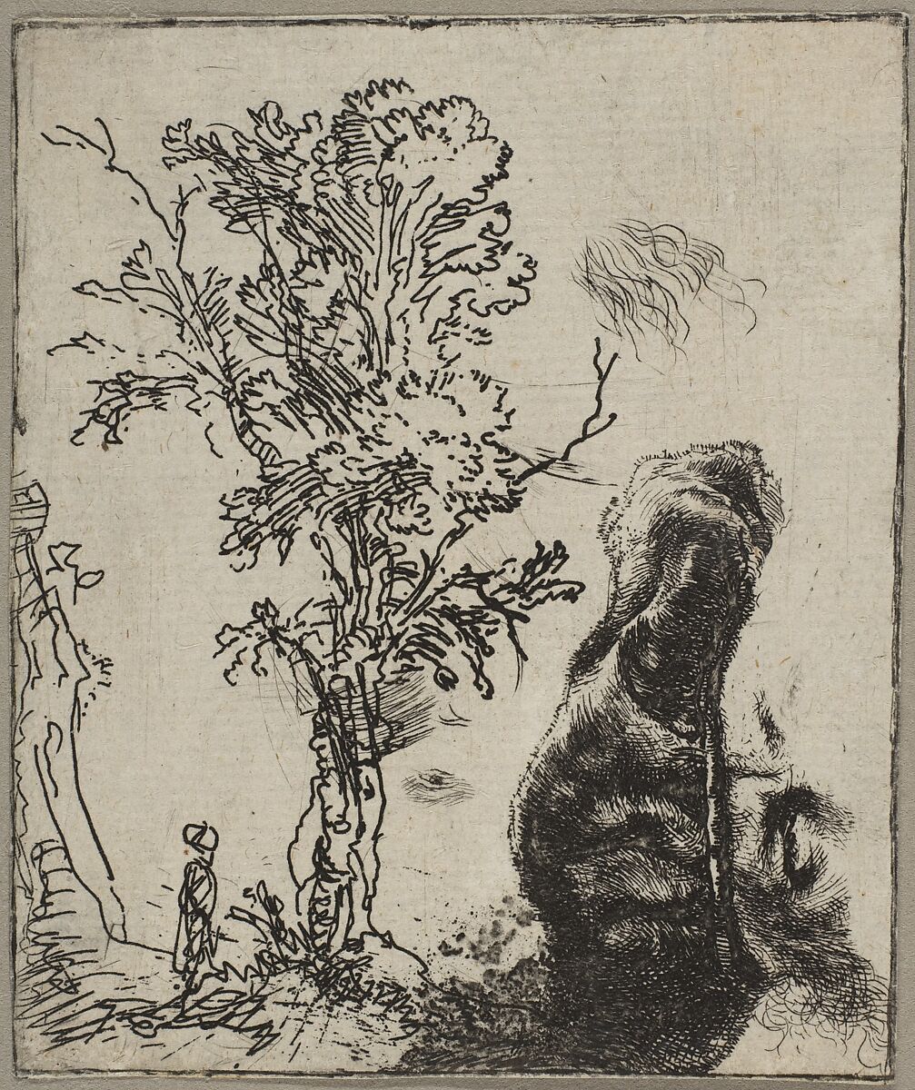 At first glance, this image looks like a small man contemplating a large tree with a mysterious dark pattern to its right. When the print is viewed sideways, it becomes clear that this area is actually the beginning of a self-portrait that Rembrandt never finished. The combination of fragmentary elements on this sheet reveals how spontaneous Rembrandt's prints could be. He moved from studying how light plays across his velvet cap and eyes, to the structure of the tree, and finished by experimenting with hatched lines in the space beside the tree and across its trunk. Significantly, the cap studied here is worn by Rembrandt in many of his self-portraits, including the Museum's painted version of 1660.