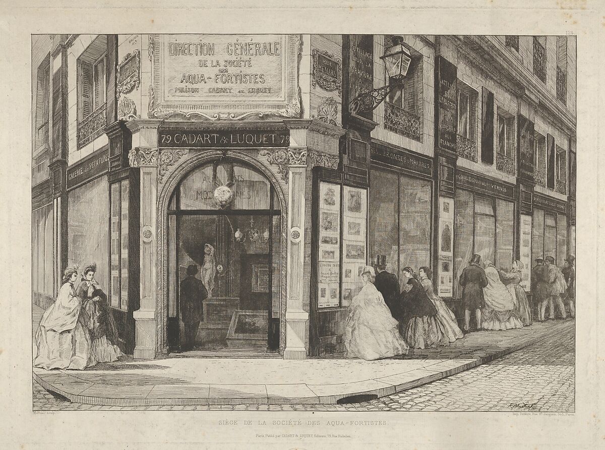 From 1862 onward, the Société des Aquafortistes promoted etching as a means of expression equal in prestige to painting and drawing. The organization ran a studio for instructing prospective etchers, produced a yearly publication promoting original prints, and sold works by participating artists from its Parisian headquarters. The shop itself was a popular destination, as is clearly indicated by the elegantly dressed crowd seen in Martial’s print, which was included in the society's 1865 album, Eaux-fortes modernes.