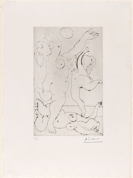 A renewed interest in the forms of classical art can be seen in Picasso's work in the 1930s, especially in the monumentality of the female nude. Here, the massive forms of the figures have been retained in a small-format print, their graceful poses expressed solely through the scratchy and irregular line of the drypoint needle.
