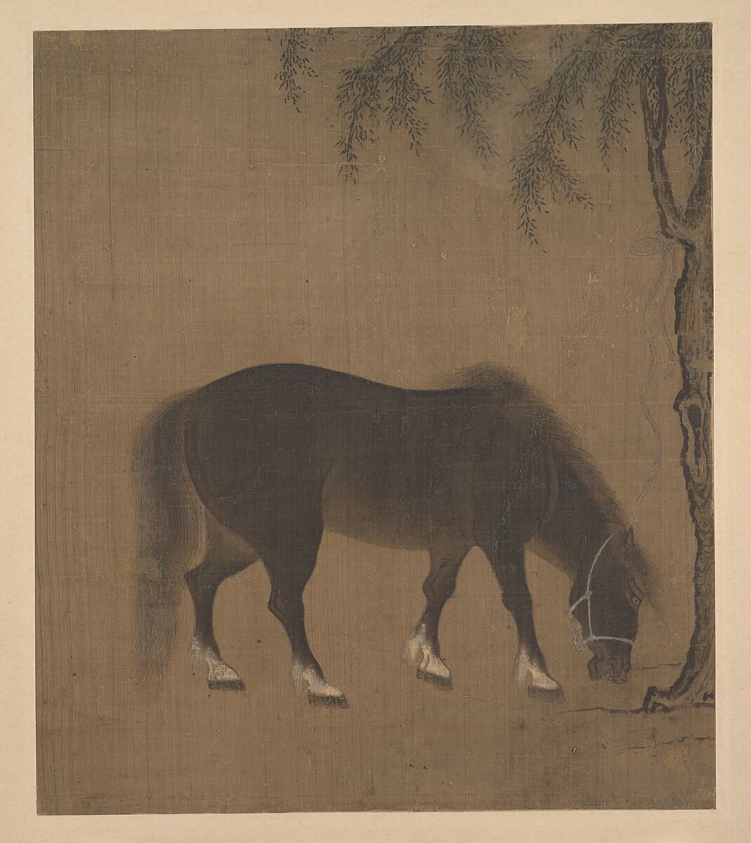 Since the Han dynasty (206 B.C.–A.D. 220), fine horses have symbolized military power and imperial authority in China. For this reason, powerful steeds were a popular subject at the early Ming court. Frequently such paintings show sleek animals grazing, often tethered to willow trees. Perhaps such images were intended to connote an empire at peace, when warhorses were not required to subdue insurrection or combat foreign invaders