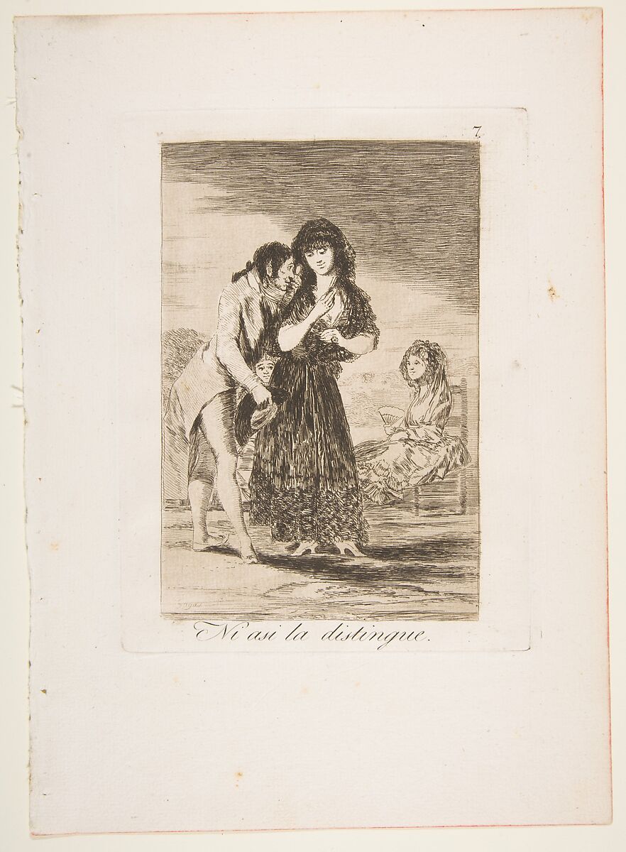 - Title: Plate 7 from "Los Caprichos": Even thus he cannot make her out (Ni asi la distingue)