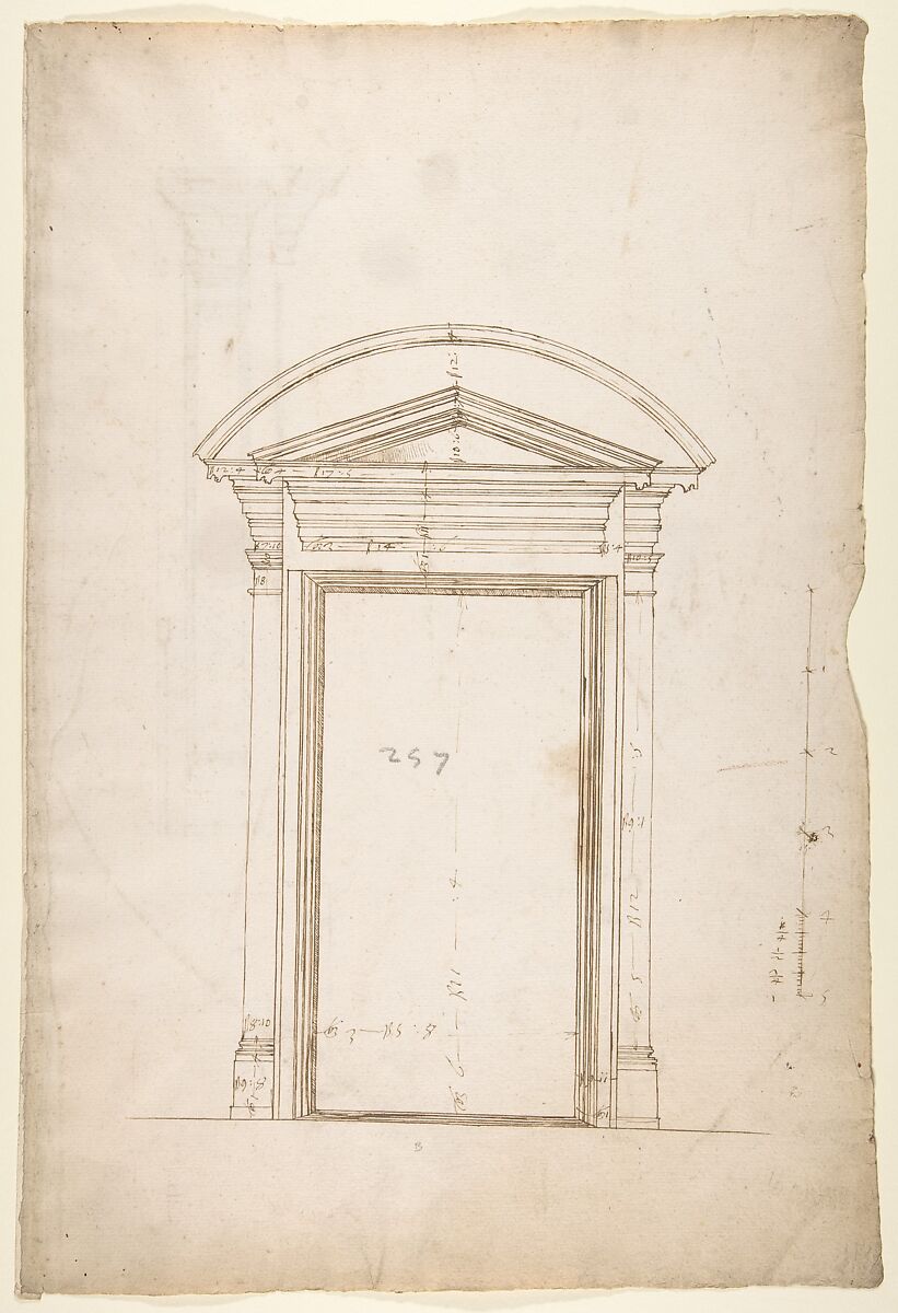 - Title:San Lorenzo, Library, Ricetto, entry portal from library, elevation (recto) San Lorenzo, Library, Ricetto, entry portal from library, plan and section (verso)