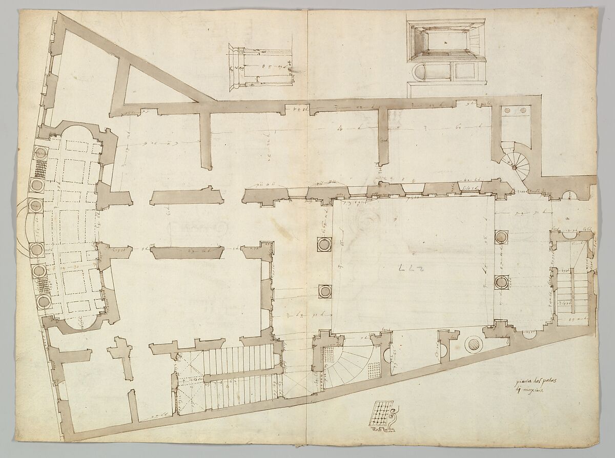 - Title: Palazzo Massimo alle Colonne, plan (recto); Palazzo Massimo alle Colonne, façade, details and fireplace (verso)