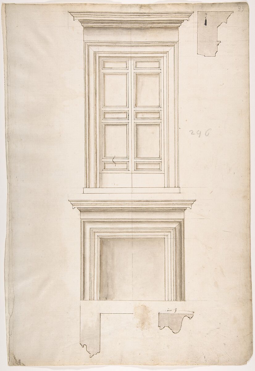 - Title:Unidentified, portal, elevation; portal, cornice, profile; fireplace, elevation (recto) blank (verso)