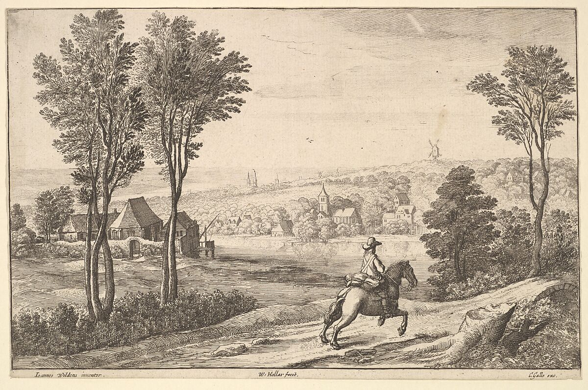 A horseman galloping to right along a country road; chapel flanked by farm houses on the bank of a river or lake at left; church, houses, windmills and spires seen on the wooded bank in background.