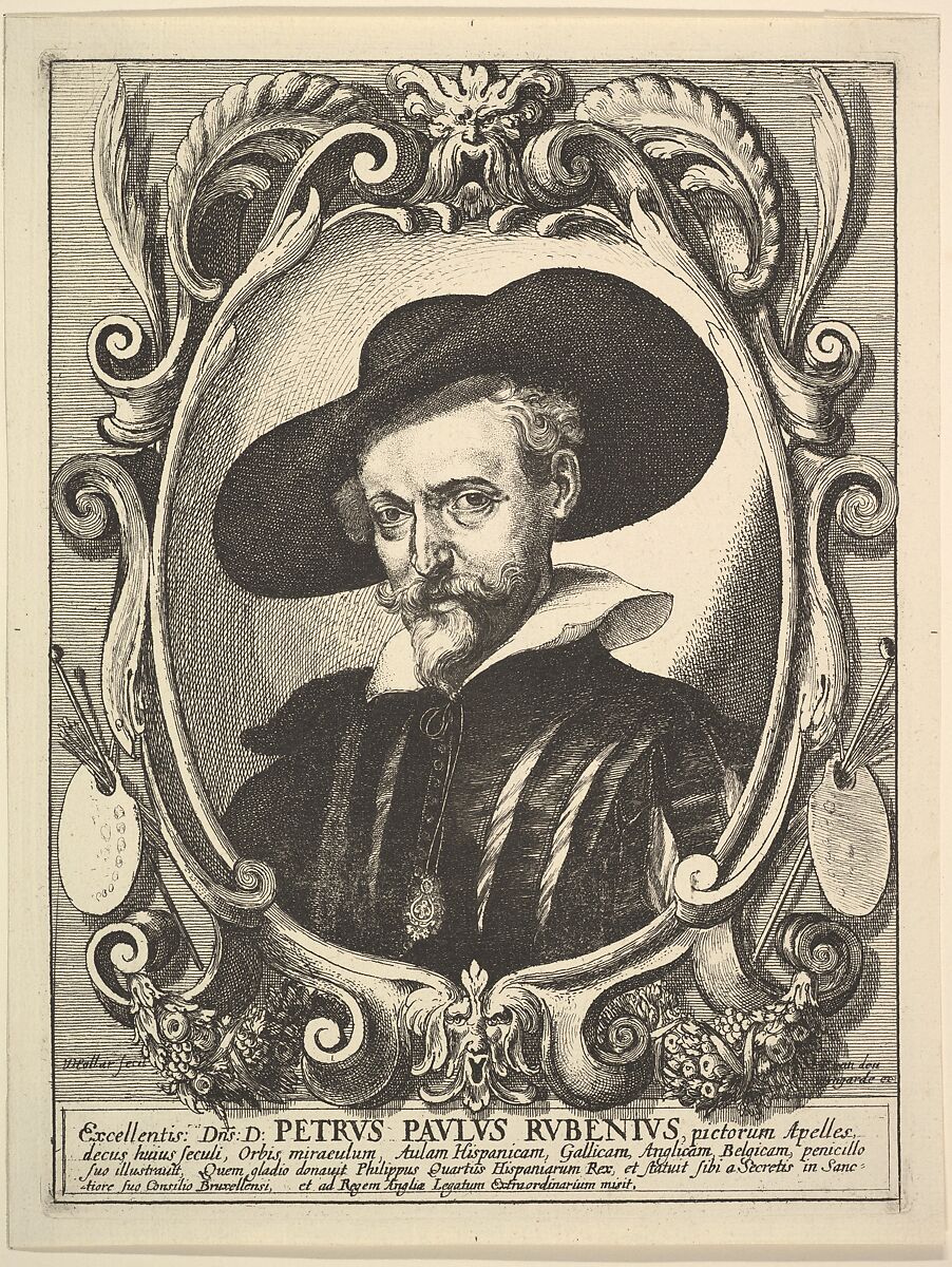 Bust-length portrait of Rubens wearing a wide-brimmed hat and slashed doublet; with in an oval ornamental frame; based on his self-portrait at the age of fifty in the Rubenshuis in Antwerp.