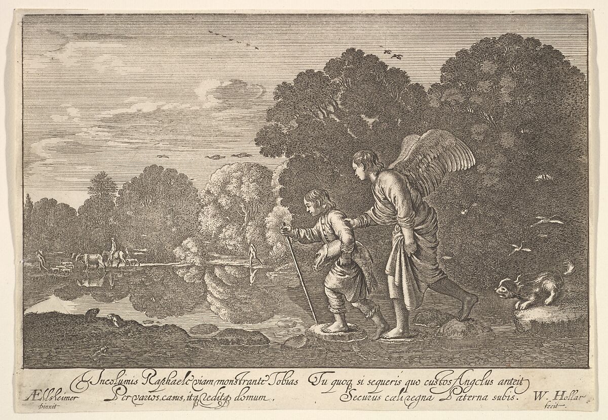 The Small Tobias; Tobias holding a fish and a stout walking stick, accompanied by the Archangel Raphael holding his arm, crossing a river on stepping stones from right to left; a copy in reverse after Goudt who engraved after Elsheimer.