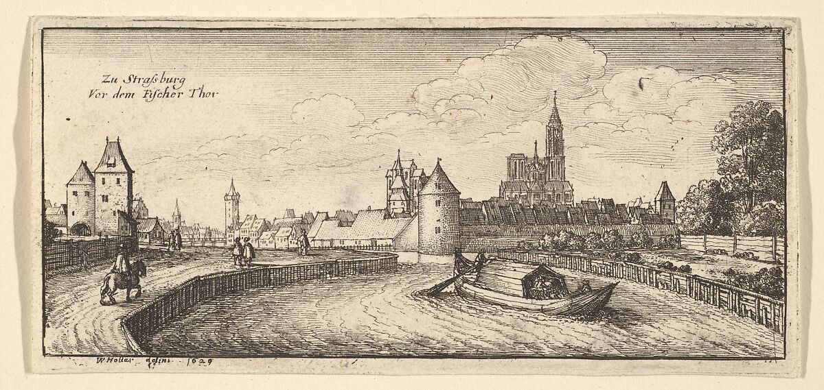 View of Strasbourg from the river; barge with cabin approaching in foreground; rider and figures on foot on a road on the left bank; city wall with tower in background, cathedral beyond.