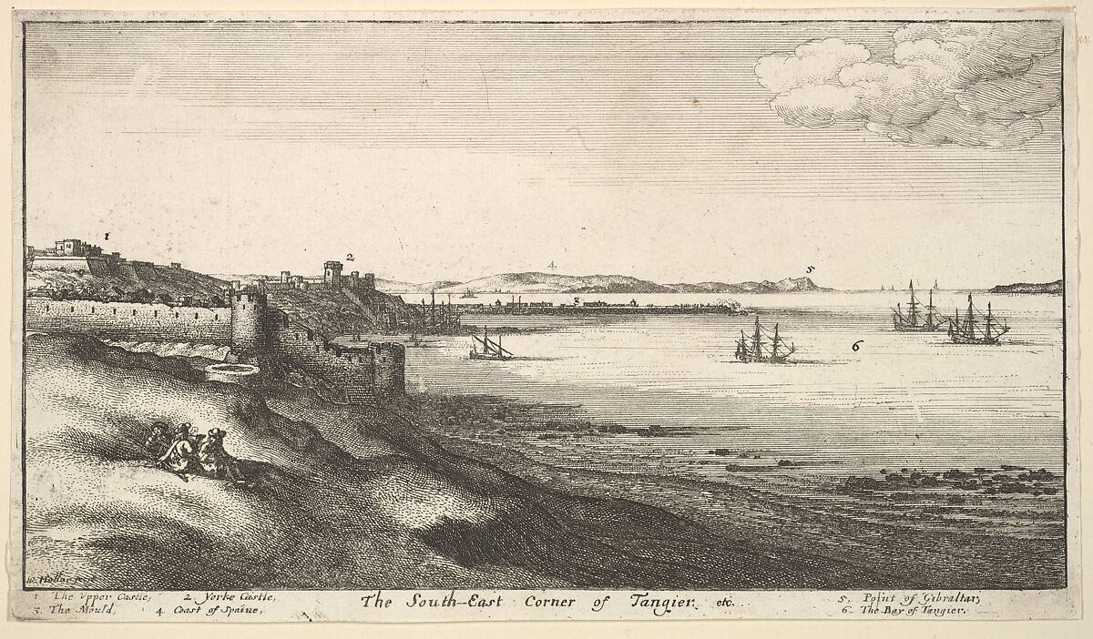 From a series of five plates and title-page of Tangier views. The bay of Tangier, with York Castle on the left and Gibraltar and the Spanish coast in the distance; at Tangier; in the foreground, three figures; ships and boats on the sea.