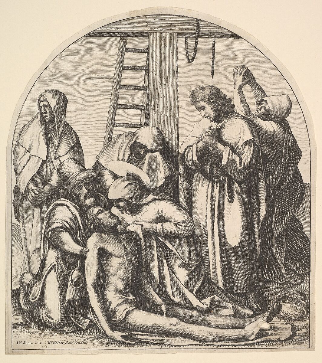 Descent from the Cross; Joseph of Arimathea and the Virgin Mary kneeling, supporting the body of Christ, St John standing at right, together with three crying women, beside the cross and ladder; after Hans Holbein the Younger.