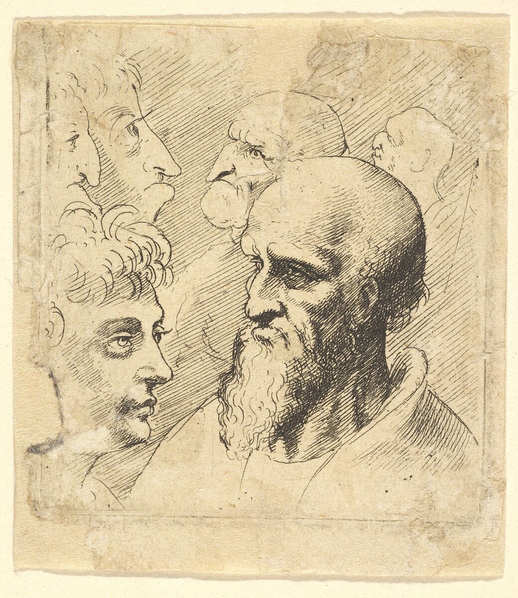 Title-page to 'Diversæ Probæ' (Antwerp, 1645), with studies of six male heads, including a young man in three-quarter profile to right, and head and shoulders of an old bearded man in three-quarter profile to left