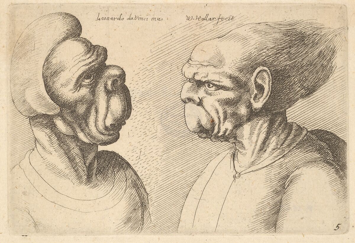 Two deformed heads both with enormous upper lips. The woman has a cap on the back of her head and the man's hair is blowing back. After Leonardo.