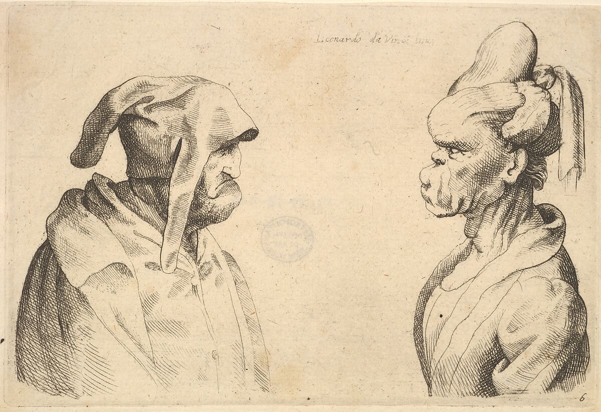 Two deformed figures face each other, after Leonardo. The attribution to Hollar is doubted by Pennington and tentatively attributed in the New Hollstein.