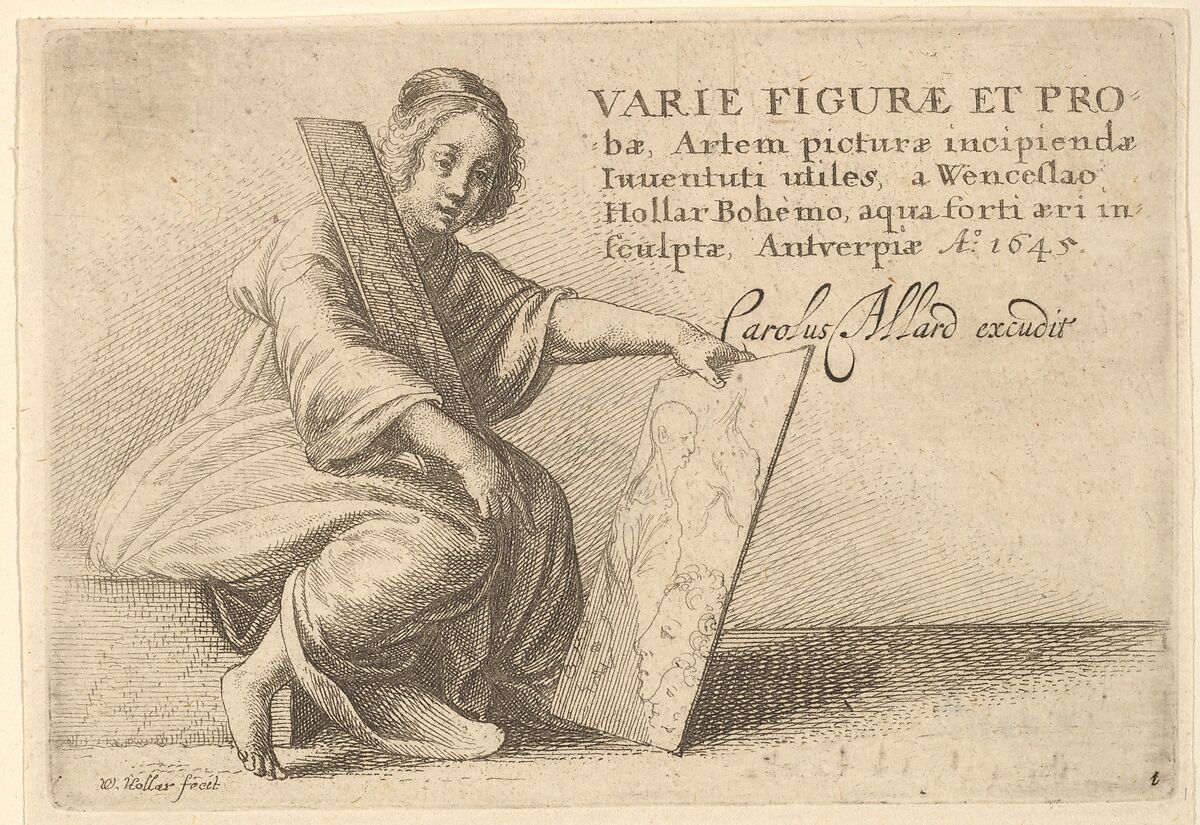 A young woman seated to right on a stone slab, looking towards the viewer with slightly open lips, holding upright on the ground a metal plate with figure studies and another on her knee; title-page to the series. Printed on the same sheet as P. 1605 and P. 1610