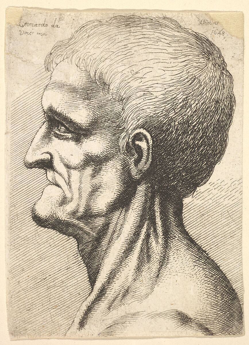 Head of a toothless man with bare, sinewy neck in profile to left, after Leonardo da Vinci