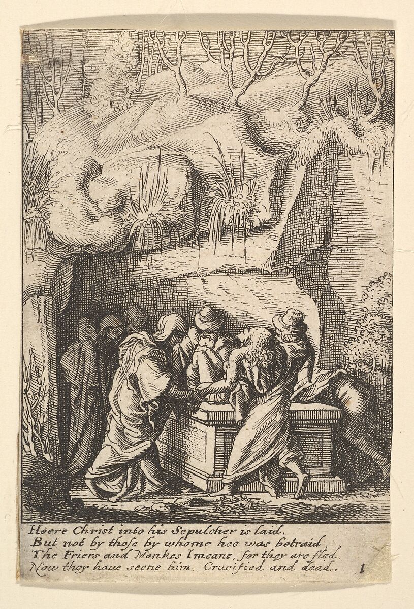 Plate 14. Christ's body is laid in a tomb in a cave, the Virgin, at left, is holding his hand. St Mary Magdalen grieves behind her; after a follower of Hans Holbein.