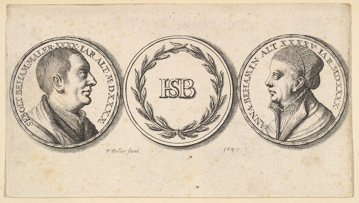Medallion with portrait of the artist Sebald Beham at left, another at right with portrait of his wife Anna; at center, medallion with monogram 'HSB', surrounded by two sprigs of laurel tied together.