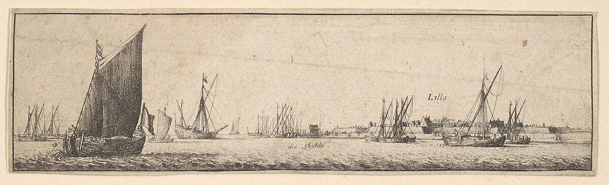 View of boats on the estuary of the river Schelde, with Lilloo in the distance at right. One of a set of 12 views in Germany, formerly in an album, now disbound. According to Vertue, these prints based on drawings made in 1632 when Hollar made a Rhine journey from Cologne.
