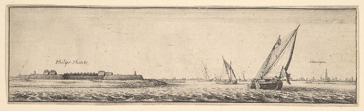 View from the river Schelde, with several boats; fort of St Philip in foreground at left, Antwerp in the distance at right. One of a set of 12 views in Germany, formerly in an album, now disbound. According to Vertue, these prints based on drawings made in 1632 when Hollar made a Rhine journey from Cologne.