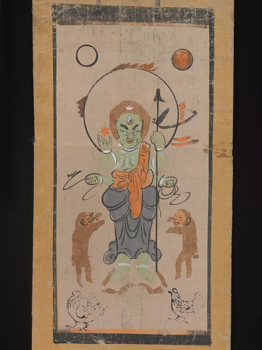 In the Edo period, images of the fierce blue-bodied deity Shōmen Kongōyasha served as the central icon for the popular rite of kōshin machi (or konoesaru machi), an all-night gathering occurring once every sixty days. In a conflation of Daoist and Buddhist beliefs, Kongōyasha presided over this gathering on the night when three worms said to reside in the human body escaped during one’s sleep to report on transgressions to the heavenly deity Taishakuten. People stayed up together to prevent the worms’ ability to leave their bodies and inform on them, thereby avoiding having their lives shortened on the basis of unfavorable reports.