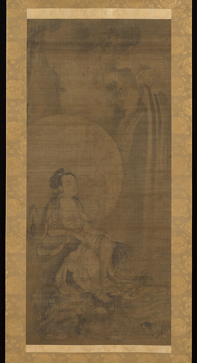 Avalokiteshvara, or Kannon in Japanese, one of the most important bodhisattvas in Mahayana Buddhism, was traditionally venerated in Zen more as a model for the contemplative life than for his traditional role as savior. This approach is reflected in the iconographic mode most favored in Zen, the white-robed Kannon. A more human image of the deity, he relaxes here near a waterfall in a woodland setting. The inclusion of Sudhana (lower right), the archetypal pilgrim youth who sought the bodhisattva in Potalaka, his island paradise, reflects Zen assimilation of Pure Land belief.