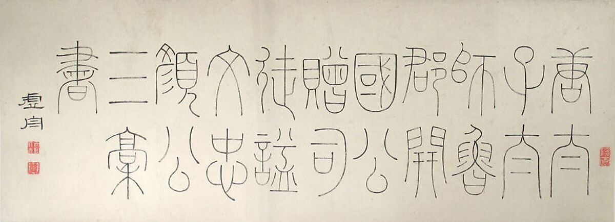 Wang Shu was a broadly learned scholar-official with a special interest in the history of calligraphy. In this scroll, he copied three famous texts by Yan Zhenqing (709–785), one of the preeminent calligraphers in Chinese history, and offered his commentary on each. The frontispiece, also by Wang, is written in the distinctive seal script, which requires the artist to maintain total control of the brush for a consistent line that mimics the effect of a stylus.