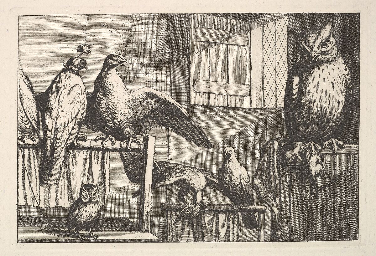 In a room a large owl sits on wooden partition at right holding a dead weasel in its right claw. On the left is a little owl with a cord around its leg; above it 3 hawks sit on perches, one is hooded. after Barlow.