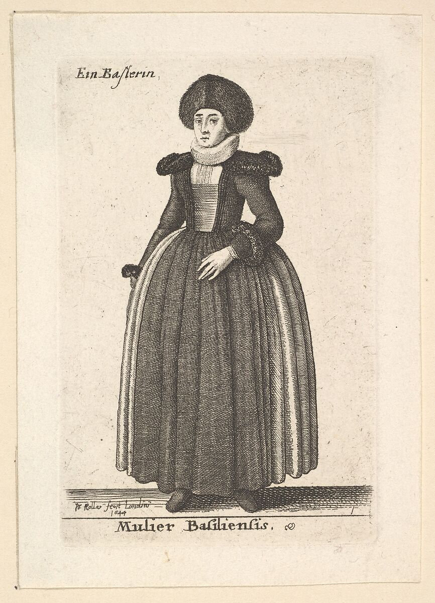 A woman of Basel standing whole length slightly to left, looking towards the viewer, her left hand on her stomach; wearing a fur cap, shoulder pads, laced bodice and apron over skirt.