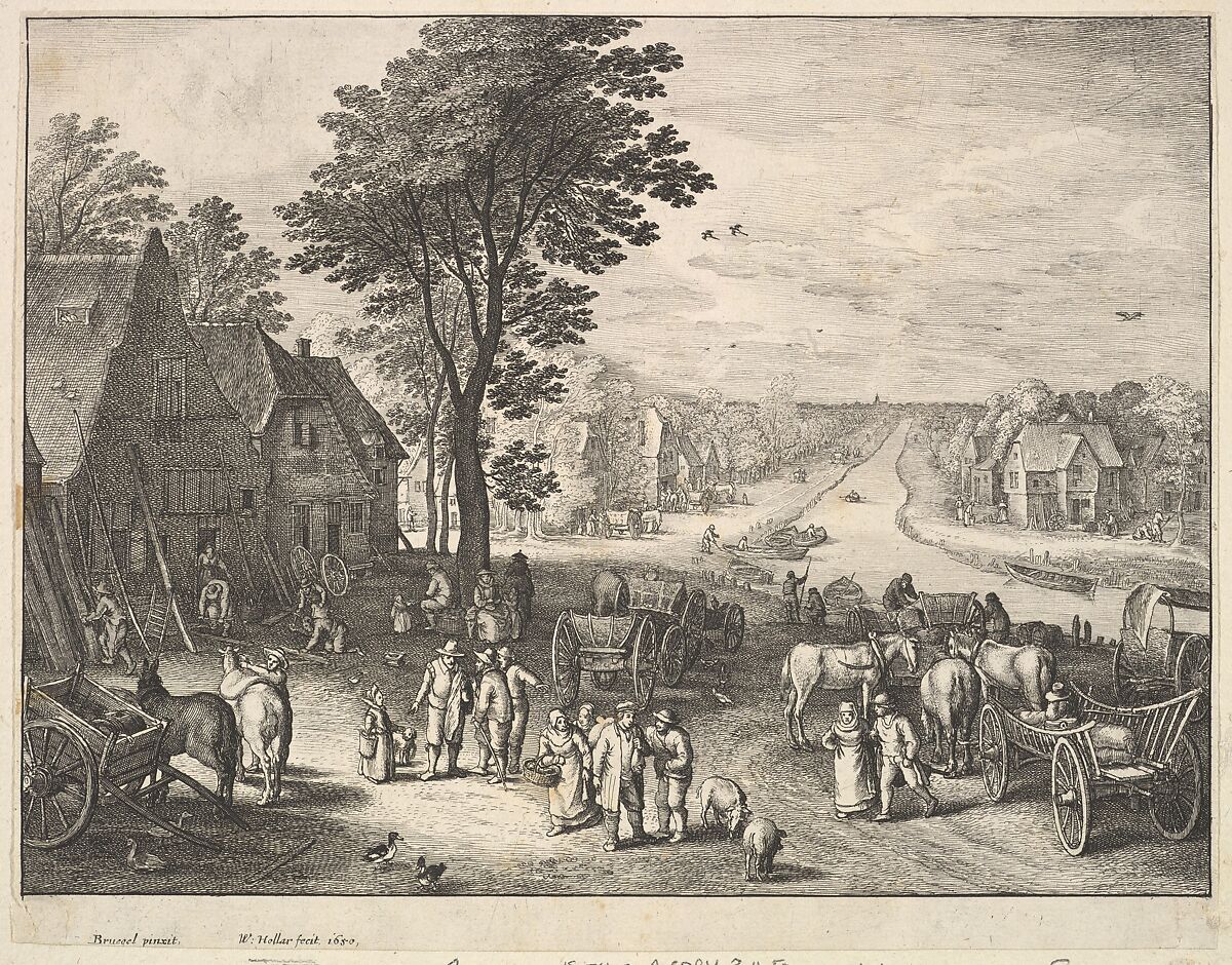 Villagers walking and conversing on the left bank of a canal among carts and horses, others seated under a tree and working near cottages