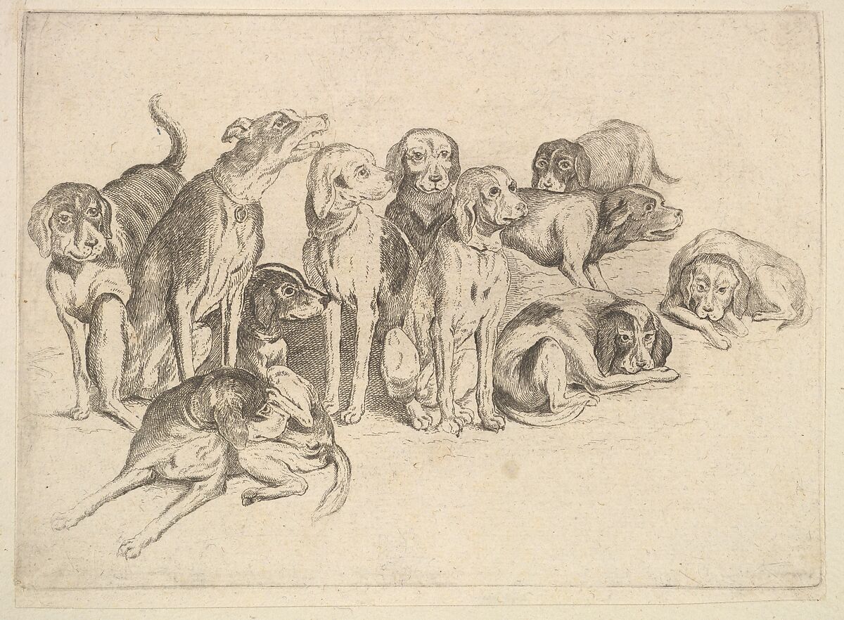 Eleven hounds, one of them lying in foreground at left, others lying, sitting and standing.