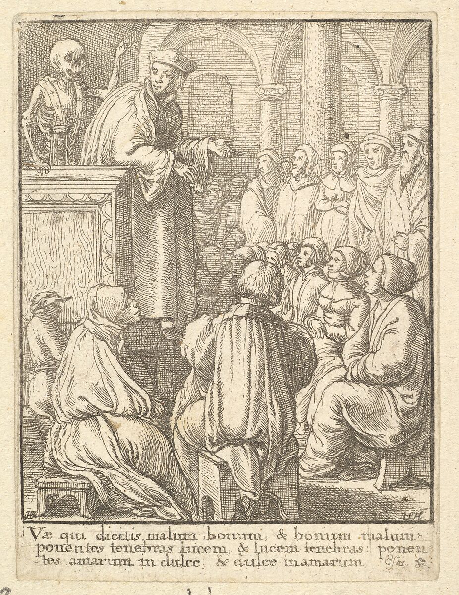 The Preacher; he stands in a pulpit on the left with a congregation part standing, part seated; Death is also preaching behind; after Holbein