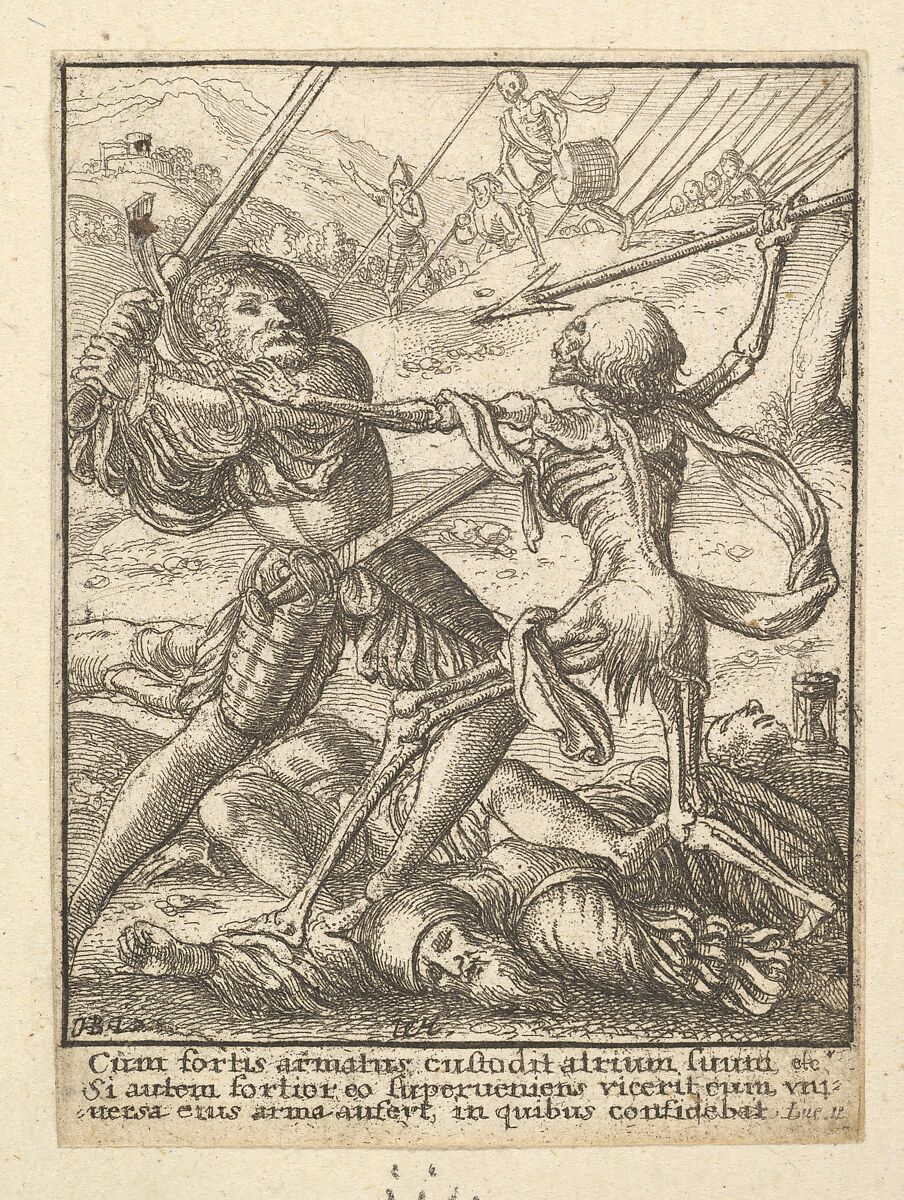 A knight raises his sword to fend off Death who is about to run a spear thru him.