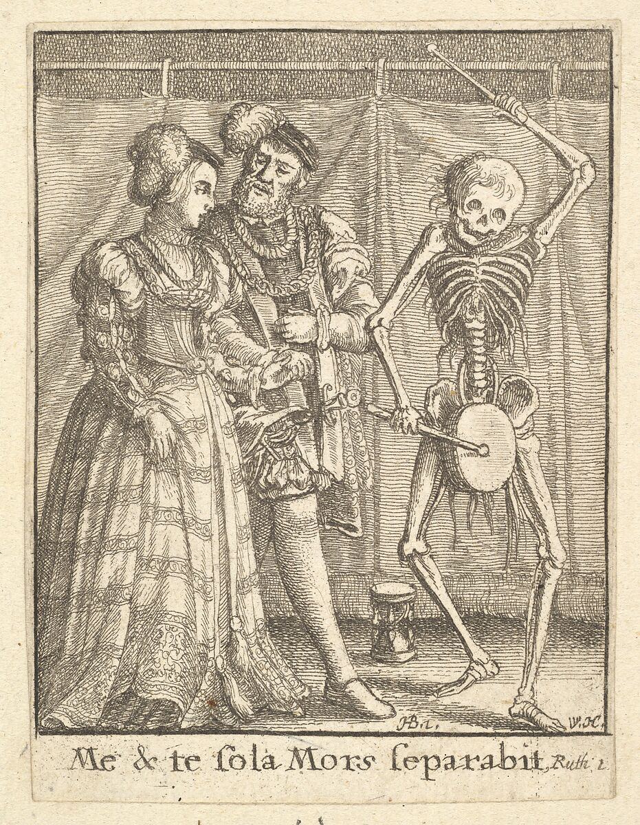 Bridal pair; the richly attired bridegroom at center leads his bride to the right, while Death goes before them beating a drum; after Hans Holbein