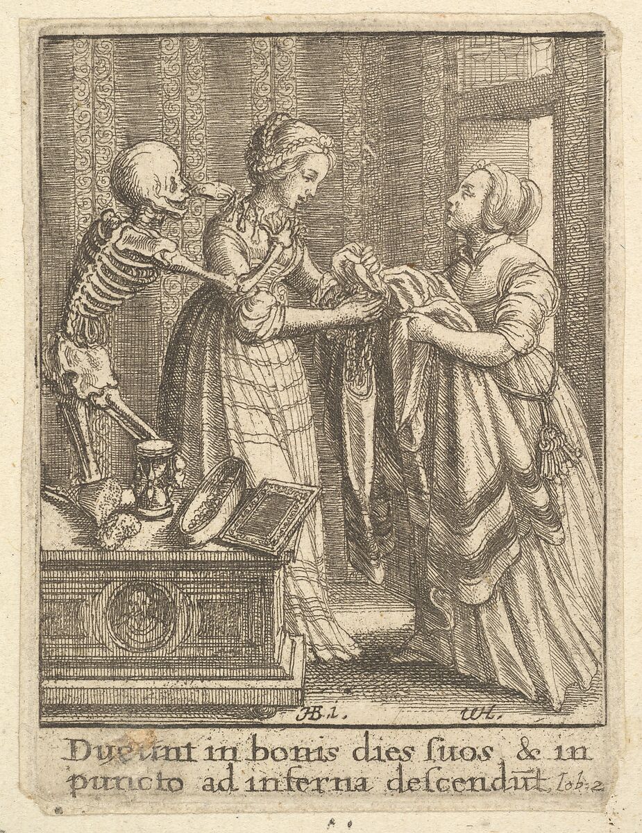 The bride's mother on the right hands the young woman a robe and chain, while Death fastens a collar of bones around her neck.