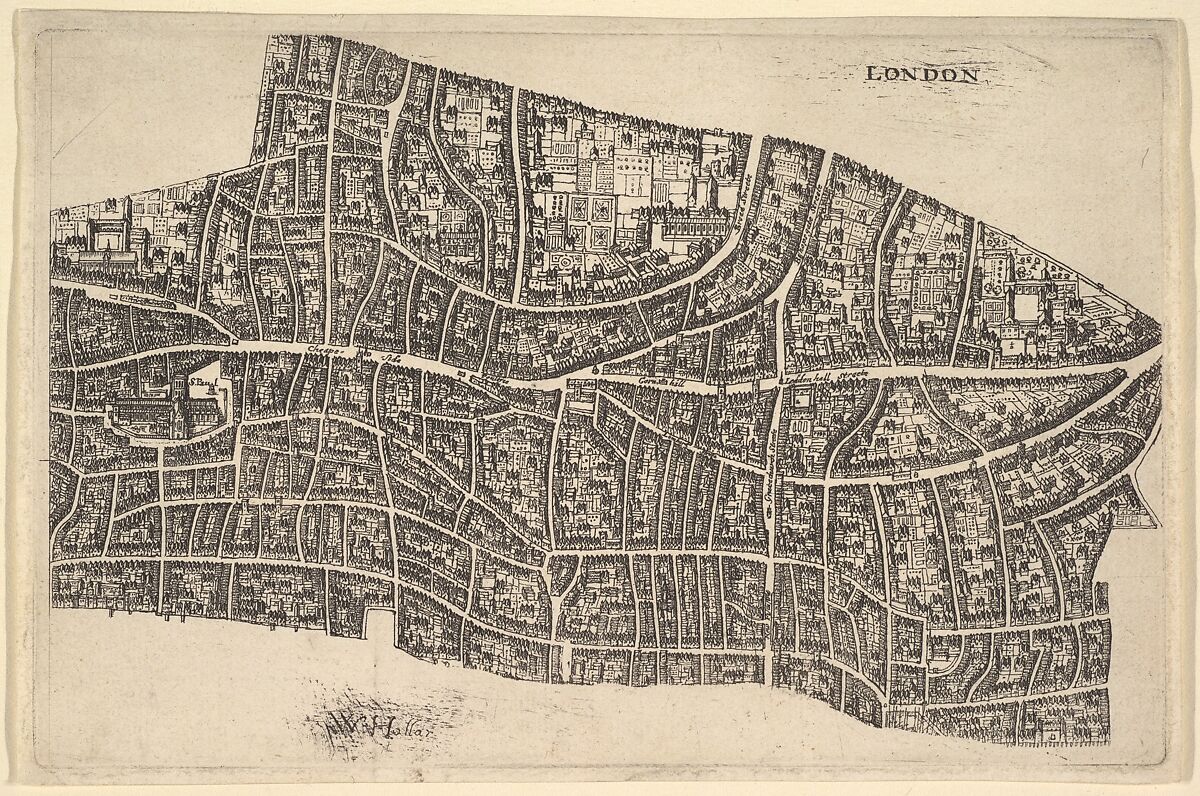 Street map of the City of London before the Great Fire of 1666; image of St Paul's Cathedral at left.