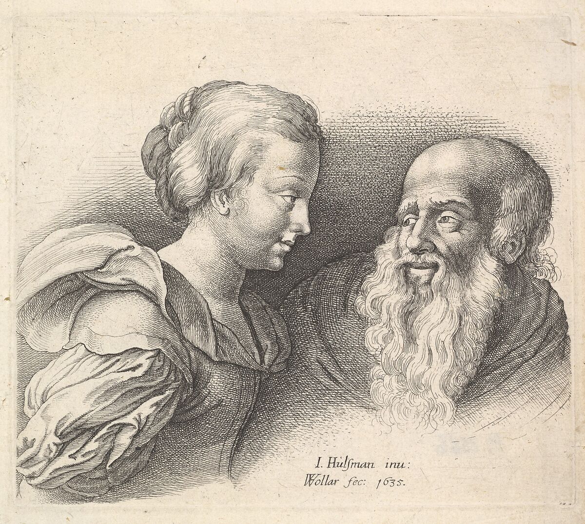 A young woman, nearly half-length, in profile to right, smiling at an old bearded man; after Jan Hulsman