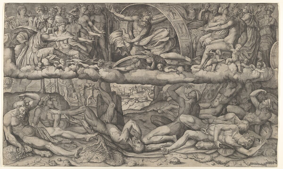 In the mid-sixteenth century, the story of Jupiter overcoming the Giants' uprising was often associated with the victories of Holy Roman Emperor Charles V (r. 1519–56) over the Protestant rebellion. Such was the case with the vault painted in about 1533 by Perino del Vaga (Pietro Buonaccorsi) in a chamber that served as a temporary throne room for the emperor in Andrea Doria's Genoese palace. This engraving records one of the preliminary drawings for the fresco. Perino follows Ovid's account in showing Jupiter fighting the Giants without help from the other Olympians, yet includes the boulders and uprooted trees mentioned by Apollodorus (Library 1.6) as weapons of the Giants.