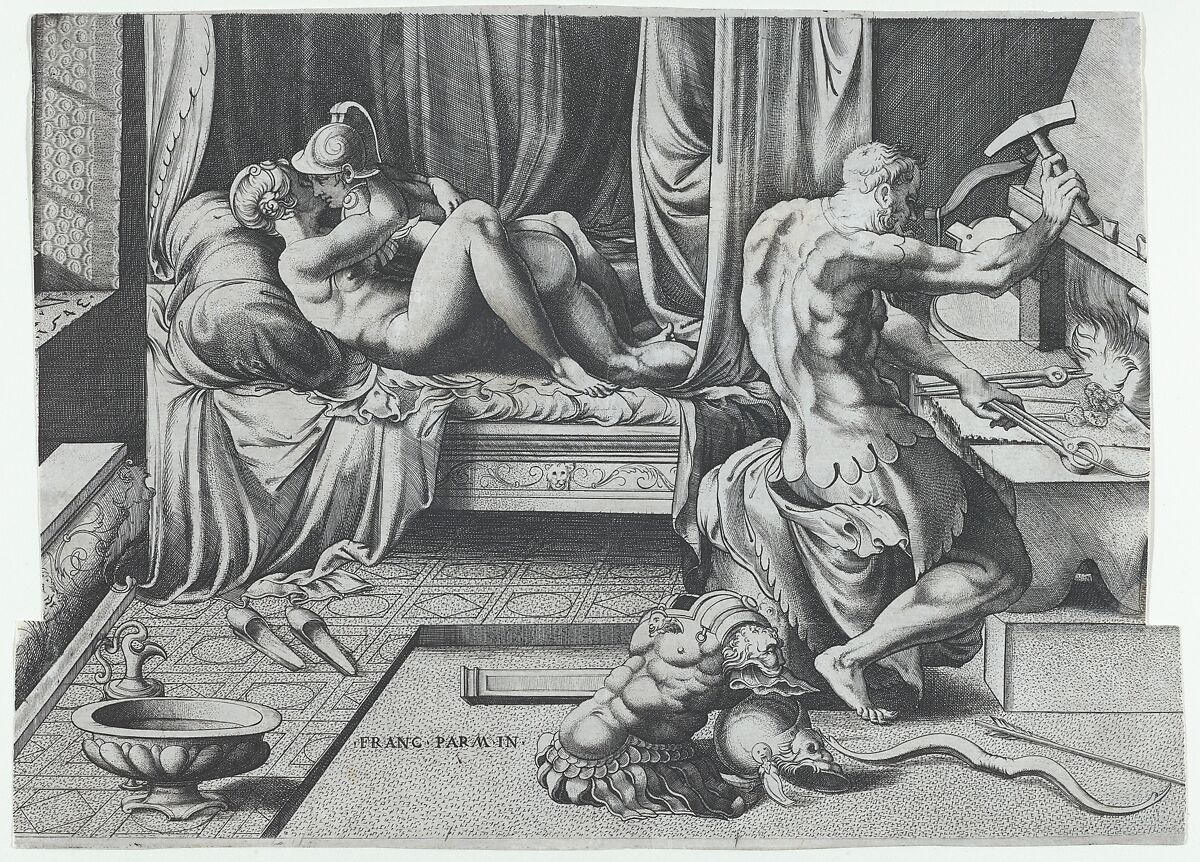 The beautiful Venus was oddly matched to the lame blacksmith Vulcan (the Greek Hephaistos), a virtuosic metalworker who forged Cupid's potent arrows as well as the elaborate armor of the gods and heroes. When the smith learned of his wife's long-running love affair with Mars (the Greek Ares), he retaliated by fashioning a net of iron so fine that it could not be seen and laying it over a bed to trap the lovers in an embrace. This print seems to depict Vulcan crafting the invisible links, while Venus and Mars continue, oblivious to his presence.